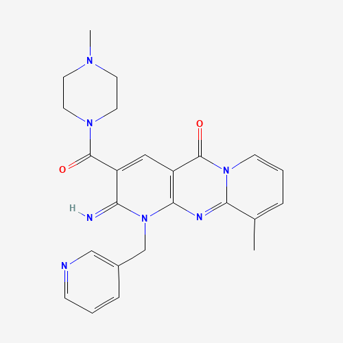 - Synonyms:2-Imino-10-methyl-3-(4-methylpiperazine-1-carbonyl)-1-(pyridin-3-ylmethyl)-1H-dipyrido[1,2-a:2',3'-d]pyrimidin-5(2H)-one;510761-59-8;ChemDiv3_004469;HMS1485L03;STL200722;AKOS000528739;IDI1_022379;BRD-K72084237-001-01-5;2-IMINO-10-METHYL-3-[(4-METHYL-1-PIPERAZINYL)CARBONYL]-1-(3-PYRIDINYLMETHYL)-1,2-DIHYDRO-5H-DIPYRIDO[1,2-A:2,3-D]PYRIMIDIN-5-ONE;2-imino-10-methyl-3-[(4-methylpiperazin-1-yl)carbonyl]-1-(pyridin-3-ylmethyl)-1,2-dihydro-5H-dipyrido[1,2-a:2',3'-d]pyrimidin-5-one