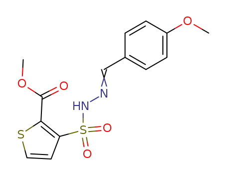 - Synonyms:2-Thiophenecarboxylicacid, 3-[[[(4-methoxyphenyl)methylene]hydrazino]sulfonyl]-, methyl ester (9CI)