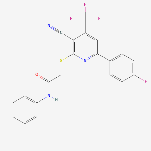 - Synonyms:STK814072;AKOS002194074;2-{[3-cyano-6-(4-fluorophenyl)-4-(trifluoromethyl)-2-pyridinyl]sulfanyl}-N-(2,5-dimethylphenyl)acetamide;2-{[3-cyano-6-(4-fluorophenyl)-4-(trifluoromethyl)pyridin-2-yl]sulfanyl}-N-(2,5-dimethylphenyl)acetamide