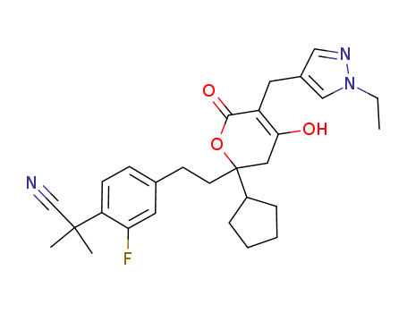 2-[4-(2-{2-cyclopentyl-5-[(1-ethyl-1H-pyrazol-4-yl)methyl]-4-hydroxy-6-oxo-3,6-dihydro-2H-pyran-2-yl}ethyl)-2-fluorophenyl]-2-methylpropanenitrile(877131-02-7)