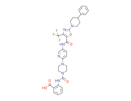 - Name: 2-(4-(5-(2-(4-phenylpiperidin-1-yl)-4-(trifluoromethyl)oxazole-5-carboxamido)pyridin-2-yl)piperazine-1-carboxamido)benzoic acid
