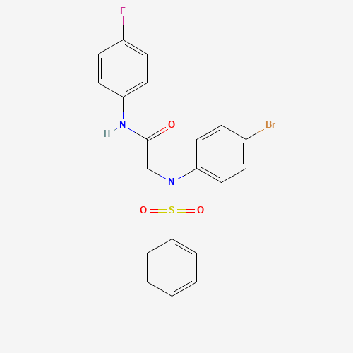 - Synonyms:6487-73-6;DTXSID80361828;STK916789;2-(4-bromo-N-(4-methylphenyl)sulfonylanilino)-N-(4-fluorophenyl)acetamide;AKOS003204705;N~2~-(4-bromophenyl)-N-(4-fluorophenyl)-N~2~-[(4-methylphenyl)sulfonyl]glycinamide