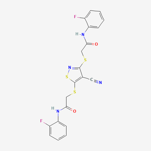 2-[(4-cyano-3-{[2-(2-fluoroanilino)-2-oxoethyl]sulfanyl}-5-isothiazolyl)sulfanyl]-N-(2-fluorophenyl)acetamide
