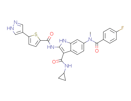 2-(5-(1H-pyrazol-4-yl)thiophene-2-carboxamido)-N-cyclopropyl-6-(4-fluoro-N-methylbenzamido)-1H-indole-3-carboxamide(1562187-59-0)