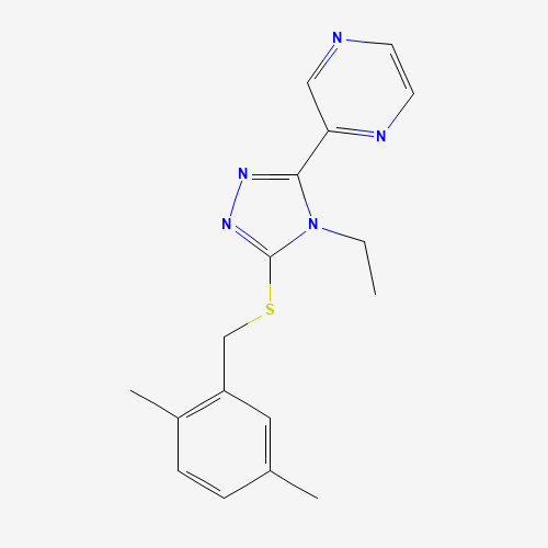 - Synonyms:2-(5-((2,5-Dimethylbenzyl)thio)-4-ethyl-4H-1,2,4-triazol-3-yl)pyrazine;586992-51-0;STL342039;AKOS002188244;2-{5-[(2,5-dimethylbenzyl)sulfanyl]-4-ethyl-4H-1,2,4-triazol-3-yl}pyrazine