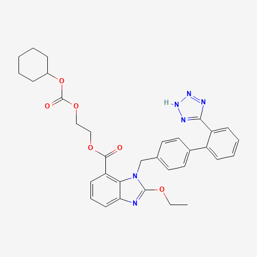 - Synonyms:160819-61-4;2-{[(cyclohexyloxy)carbonyl]oxy}ethyl 2-ethoxy-1-{[2'-(1H-tetrazol-5-yl)biphenyl-4-yl]methyl}-1H-benzimidazole-7-carboxylate;SCHEMBL5511763;DTXSID301102501;AKOS015955541;VS-10589;2-{[(cyclohexyloxy)carbonyl]oxy}ethyl 2-ethoxy-1-{[2'-(1H-1,2,3,4-tetrazol-5-yl)-[1,1'-biphenyl]-4-yl]methyl}-1H-1,3-benzodiazole-7-carboxylate;2-cyclohexyloxycarbonyloxyethyl 2-ethoxy-3-[[4-[2-(2H-tetrazol-5-yl)phenyl]phenyl]methyl]benzimidazole-4-carboxylate