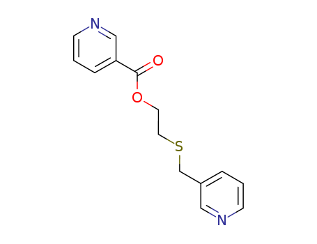 - Synonyms:NICOTINIC ACID,2-((3-PYRIDYLMETHYL)THIO)ETHYL ESTER;2-((3-Pyridinylmethyl)thio)ethyl nicotinate;3-Pyridinecarboxylicacid,2-[(3-pyridinylmethyl)thio]ethyl ester;Nicotinsaeure-(2-[3]pyridylmethylmercapto-aethylester);nicotinic acid-(2-[3]pyridylmethylsulfanyl-ethyl ester);