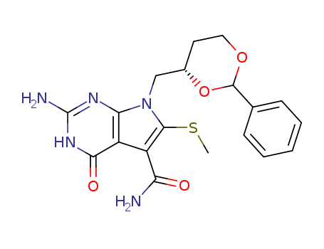 - Synonyms:2-amino-5-(aminocarbonyl)-6-(methylthio)-7-<(S)-2,4-O-benzylidene-2,4-dihydroxybutyl>pyrrolo<2,3-d>pyrimidin-4-one