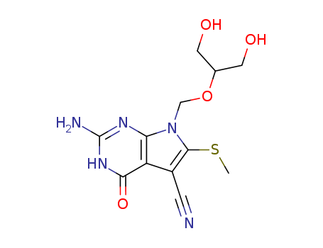 - Synonyms:1H-Pyrrolo[2,3-d]pyrimidine-5-carbonitrile,2-amino-4,7-dihydro-7-[[2-hydroxy-1-(hydroxymethyl)ethoxy]methyl]-6-(methylthio)-4-oxo-(9CI)