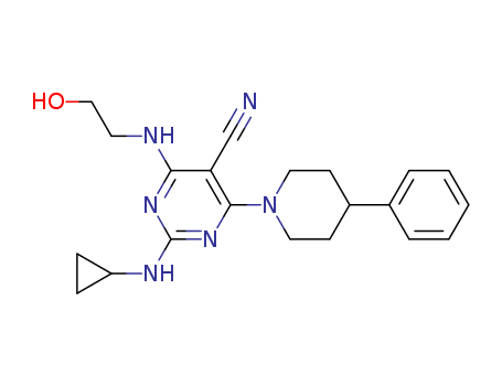- Synonyms:2-cyclopropylamino-4-(2-hydroxy-ethylamino)-6-(4-phenyl-piperidin-1-yl)-pyrimidine-5-carbonitrile