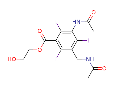 - Synonyms:Benzoicacid, 3-acetamido-5-(acetamidomethyl)-2,4,6-triiodo-, 2-hydroxyethyl ester(8CI); m-Toluic acid, a,5-diacetamido-2,4,6-triiodo-, 2-hydroxyethyl ester (7CI)