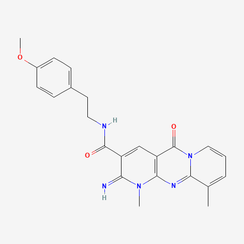 - Synonyms:TCMDC-125129;2-imino-N-[2-(4-methoxyphenyl)ethyl]-1,10-dimethyl-5-oxo-1,5-dihydro-2H-dipyrido[1,2-a:2',3'-d]pyrimidine-3-carboxamide;848204-43-3;6-Imino-N-[2-(4-methoxyphenyl)ethyl]-7,11-dimethyl-2-oxo-1,7,9-triazatricyclo[8.4.0.03,8]tetradeca-3(8),4,9,11,13-pentaene-5-carboxamide;CHEMBL524610;AKOS005181379;Z1213742410