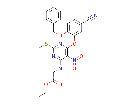 - Synonyms:2-methylthio-4-(ethoxycarbonylmethyl)amino-5-nitro-6-(2-benzyloxy-5-cyanophenoxy)pyrimidine