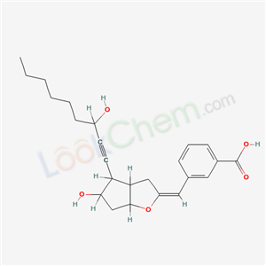 - Synonyms:CH 18 783;Benzoic acid,3-((hexahydro-5-hydroxy-4-(3-hydroxy-1-monynyl)-2H-cyclopenta(b)furan-2-ylidene)methyl)-,(3aR-(2Z,3aalpha,4alpha(S*),5beta,6aalpha));IFPG;20-Methyl-13,14-didehydro-2,4-m-interphenylene-pgi2;20-Methyl-13,14-didehydro-2,4-inter-3-phenylene prostaglandin I2;
