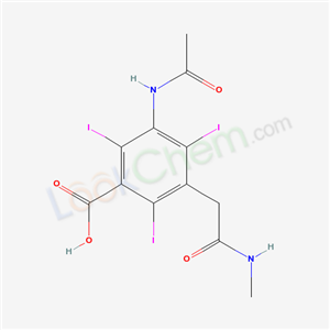 - Synonyms:(5-Acetamino-3-carboxy-2,4,6-trijod-phenyl)-essigsaure-methylamid [French];3-Acetylamino-2,4,6-triiodo-5-[2-(methylamino)-2-oxoethyl]benzoic acid;(5-Acetamino-3-carboxy-2,4,6-trijod-phenyl)-essigsaure-methylamid;BENZOIC ACID,3-ACETAMIDO-5-(METHYLCARBAMOYLMETHYL);Acetanilide,3-carboxy-5-(methylcarbamoylmethyl)-2,4,6-triiodo;