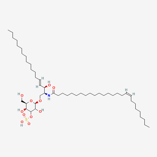 - Synonyms:3-O-Sulfogalactosylceramide (d18:1/26:1(17Z));CHEBI:184402;Sulfatide (d18:1/26:1(17Z));(17Z)-N-[(2S,3R,4E)-1-{[(2R,5S,6R)-3,5-dihydroxy-6-(hydroxymethyl)-4-(sulfooxy)oxan-2-yl]oxy}-3-hydroxyoctadec-4-en-2-yl]hexacos-17-enimidic acid;[(2R,5S,6R)-2-[(E,2S,3R)-2-[[(Z)-hexacos-17-enoyl]amino]-3-hydroxyoctadec-4-enoxy]-3,5-dihydroxy-6-(hydroxymethyl)oxan-4-yl] hydrogen sulate;[(2R,5S,6R)-2-{[(2S,3R,4E)-2-[(17Z)-hexacos-17-enamido]-3-hydroxyoctadec-4-en-1-yl]oxy}-3,5-dihydroxy-6-(hydroxymethyl)oxan-4-yl]oxidanesulfonic acid;[R-[R*,S*-(E)]]-N-[2-hydroxy-1-[[(3-O-sulfo-b-D-galactopyranosyl)oxy]methyl]-3-heptadecenyl]-17-Hexcacosenamide;[R-[R*,S*-(E)]]-N-[2-hydroxy-1-[[(3-O-sulfo-beta-delta-galactopyranosyl)oxy]methyl]-3-heptadecenyl]-17-Hexcacosenamide;N-[(1S,2R,3E)-2-hydroxy-1-[[(3-O-sulfo-b-D-galactopyranosyl)oxy]methyl]-3-heptadecen-1-yl]-17-Hexacosenamide;N-[(1S,2R,3E)-2-hydroxy-1-[[(3-O-sulfo-beta-delta-galactopyranosyl)oxy]methyl]-3-heptadecen-1-yl]-17-Hexacosenamide