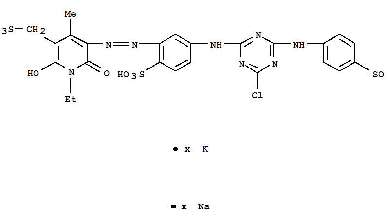 - Synonyms:3-Pyridinemethanesulfonicacid,5-[[5-[[4-chloro-6-[(4-sulfophenyl)amino]-1,3,5-triazin-2-yl]amino]-2-sulfophenyl]azo]-1-ethyl-1,6-dihydro-2-hydroxy-4-methyl-6-oxo-,potassium sodium salt (9CI)