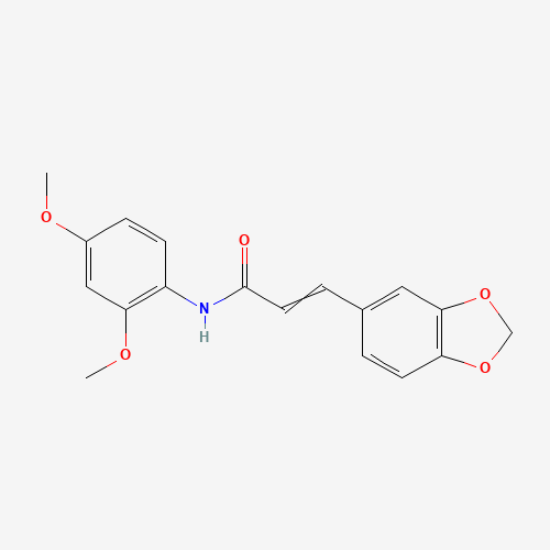 - Synonyms:3-(1,3-benzodioxol-5-yl)-N-(2,4-dimethoxyphenyl)acrylamide;DTXSID401176727;3-(1,3-benzodioxol-5-yl)-N-(2,4-dimethoxyphenyl)prop-2-enamide;AKOS033971607;3-(1,3-Benzodioxol-5-yl)-N-(2,4-dimethoxyphenyl)-2-propenamide;(E)-3-(benzo[d][1,3]dioxol-5-yl)-N-(2,4-dimethoxyphenyl)acrylamide