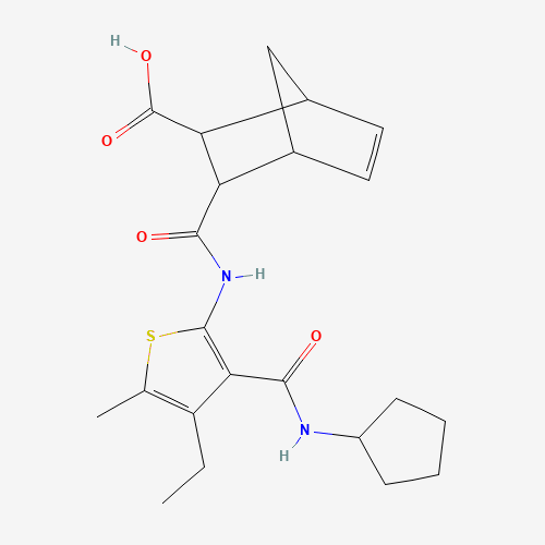 - Synonyms:1052551-00-4;3-{[3-(cyclopentylcarbamoyl)-4-ethyl-5-methylthiophen-2-yl]carbamoyl}bicyclo[2.2.1]hept-5-ene-2-carboxylic acid;3-[({3-[(cyclopentylamino)carbonyl]-4-ethyl-5-methyl-2-thienyl}amino)carbonyl]bicyclo[2.2.1]hept-5-ene-2-carboxylic acid;3-[[[3-[(Cyclopentylamino)carbonyl]-4-ethyl-5-methyl-2-thienyl]amino]carbonyl]bicyclo[2.2.1]hept-5-ene-2-carboxylic acid;3-[[3-(cyclopentylcarbamoyl)-4-ethyl-5-methylthiophen-2-yl]carbamoyl]bicyclo[2.2.1]hept-5-ene-2-carboxylic acid;DTXSID801105081;STK471305;AKOS003320736;AKOS022155107