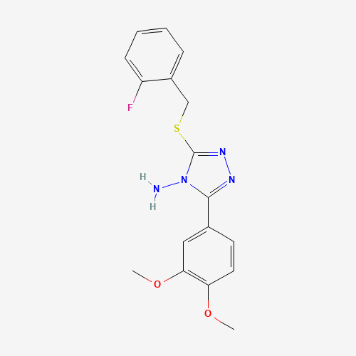 - Synonyms:577963-05-4;3-(3,4-DIMETHOXYPHENYL)-5-((2-FLUOROBENZYL)THIO)-4H-1,2,4-TRIAZOL-4-YLAMINE;3-(3,4-Dimethoxyphenyl)-5-((2-fluorobenzyl)thio)-4H-1,2,4-triazol-4-amine;STL341618;AKOS002188590;3-(3,4-dimethoxyphenyl)-5-[(2-fluorobenzyl)sulfanyl]-4H-1,2,4-triazol-4-amine