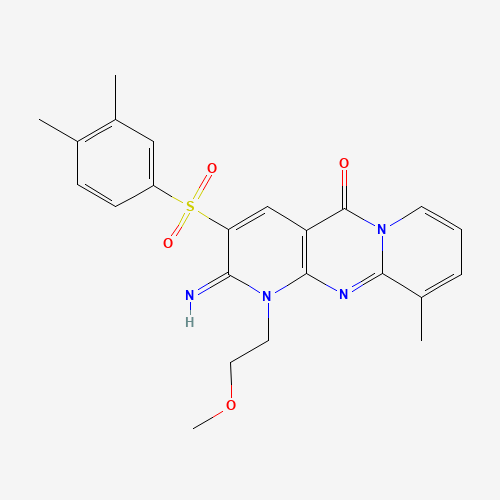 - Synonyms:853753-72-7;3-[(3,4-dimethylphenyl)sulfonyl]-2-imino-1-(2-methoxyethyl)-10-methyl-1,2-dihydro-5H-dipyrido[1,2-a:2,3-d]pyrimidin-5-one;5-(3,4-Dimethylphenyl)sulfonyl-6-imino-7-(2-methoxyethyl)-11-methyl-1,7,9-triazatricyclo[8.4.0.03,8]tetradeca-3(8),4,9,11,13-pentaen-2-one;AKOS001445656;AO-022/43454980;Z324553392