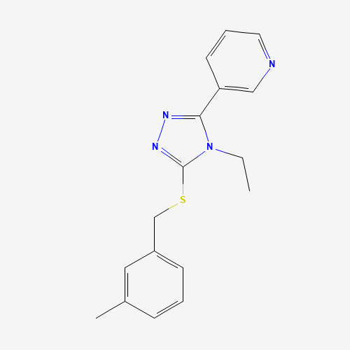 - Synonyms:577696-07-2;3-(4-Ethyl-5-((3-methylbenzyl)thio)-4H-1,2,4-triazol-3-yl)pyridine;3-{4-ethyl-5-[(3-methylbenzyl)sulfanyl]-4H-1,2,4-triazol-3-yl}pyridine;SCHEMBL15983537;STL341458;AKOS002190389