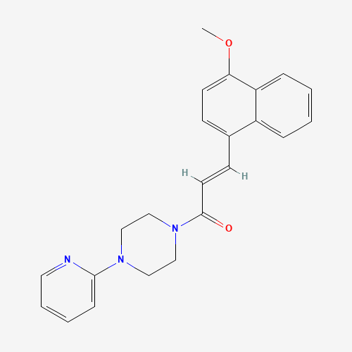 - Synonyms:3-(4-methoxy-1-naphthyl)-1-[4-(2-pyridinyl)piperazino]-2-propen-1-one;882079-52-9;(E)-3-(4-methoxynaphthalen-1-yl)-1-(4-pyridin-2-ylpiperazin-1-yl)prop-2-en-1-one;(2E)-3-(4-methoxynaphthalen-1-yl)-1-[4-(pyridin-2-yl)piperazin-1-yl]prop-2-en-1-one;MLS000721792;CHEMBL1484116;HMS2718N13;AKOS005106319;JS-2020;SMR000336932;SR-01000309695;SR-01000309695-1;1-(3-(4-METHOXY-1-NAPHTHYL)ACRYLOYL)-4-(2-PYRIDINYL)PIPERAZINE