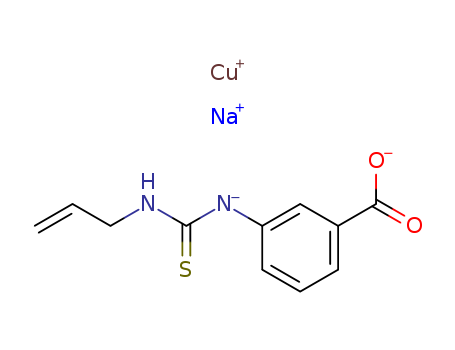 - Synonyms:Benzoicacid, 3-[[(2-propenylamino)thioxomethyl]amino]-, monocopper(1+) monosodium salt(9CI); Benzoic acid, m-[(N-allyl-1-mercaptoformimidoyl)amino]-, Cu deriv.,sodium salt (6CI); Benzoic acid, m-[(N-allyl-1-mercaptoformimidoyl)amino]-,monocopper(1+) monosodium salt (8CI); 3-(3-Allyl-S-cupropseudothioureido)benzoicacid sodium salt; Allocupreide sodium; Cupralene; Cupralyl sodium; Cuprelon;Cuprion; Cuproallylthiourea-m-benzoic acid, sodium salt; Cuprothiosinaminem-benzoate sodium; Ebesal; Sodium 3-(allylcuprothioureido)benzoate; Sodiumcuproallylthiourea-m-benzoate; m-[[(Allylimino)mercaptomethyl]amino]benzoicacid S-copper deriv. sodium salt
