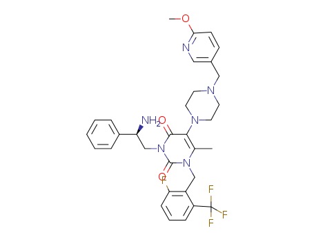 3-((R)-2-amino-2-phenyl-ethyl)-1-(2-fluoro-6-trifluoromethyl-benzyl)-5-[4-(6-methoxy-pyridin-3-ylmethyl)-piperazin-1-yl]-6-methyl-1H-pyrimidine-2,4-dione(1308377-70-9)