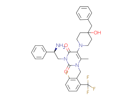 - Name: 3-((R)-2-amino-2-phenyl-ethyl)-5-(4-benzyl-4-hydroxypiperidin-1-yl)-1-(2-fluoro-6-trifluoromethyl-benzyl)-6-methyl-1H-pyrimidine-2,4-dione