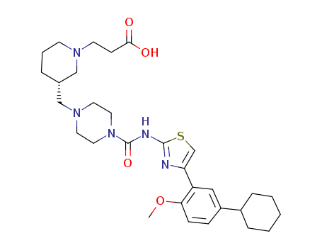 - Synonyms:3-((R)-3-{4-[4-(5-cyclohexyl-2-methoxyphenyl)thiazol-2-ylcarbamoyl]piperazin-1-ylmethyl}piperidin-1-yl)propionic acid