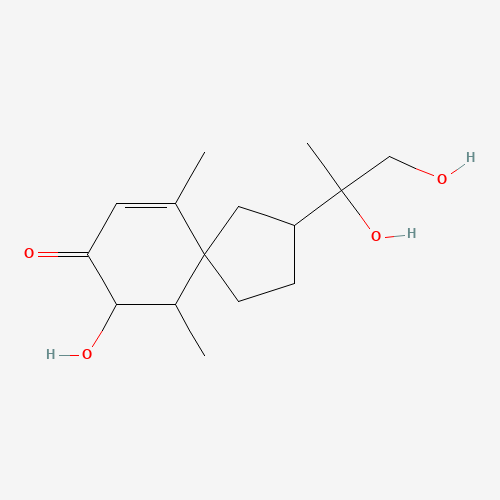 - Synonyms:220328-04-1;3,11,12-Trihydroxyspirovetiv-1(10)-en-2-one;3,11,12-Trihydroxy-1(10)-spirovetiven-2-one;3-(1,2-dihydroxypropan-2-yl)-7-hydroxy-6,10-dimethylspiro[4.5]dec-9-en-8-one;2-(1,2-dihydroxypropan-2-yl)-9-hydroxy-6,10-dimethylspiro[4.5]dec-6-en-8-one;84321-96-0;CHEBI:168108;DTXSID401135349;2-(1,2-Dihydroxy-1-methylethyl)-9-hydroxy-6,10-dimethylspiro[4.5]dec-6-en-8-one;2-(1',2'-dihydroxy-1'-methylethyl)-6,10-dimethyl-9-hydroxyspiro<4,5>dec-6-en-8-one;2-(1',2'-Dihydroxy-1'-methylethyl)-6,10-dimethyl-9-hydroxyspiro[4,5]dec-6-en-8-one;2-(1,2-Dihydroxy-1-methylethyl)-6,10-dimethyl-9-hydroxyspiro[4.5]dec-6-en-8-one;2-(1,2-Dihydroxy-1-methylethyl)-9-hydroxy-6,10-dimethylspiro[4.5]dec-6-en-8-one #