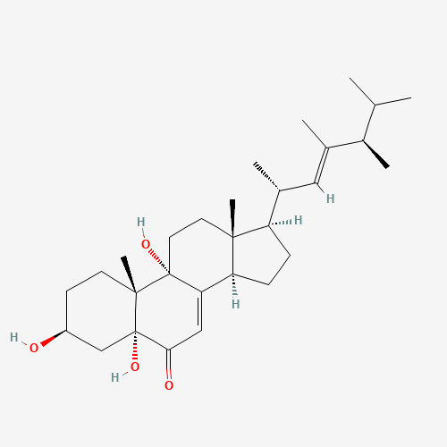 - Synonyms:DTXSID801166273;(22E,24R)-3beta,5,9-Trihydroxy-23-methyl-5alpha-ergosta-7,22-dien-6-one;3beta,5alpha,9alpha-trihydroxy-(22e,24r)-23-methyl-ergosta-7,22-dien-6-one;Ergosta-7,22-dien-6-one, 3,5,9-trihydroxy-23-methyl-, (3beta,5alpha,22E)-;211486-12-3