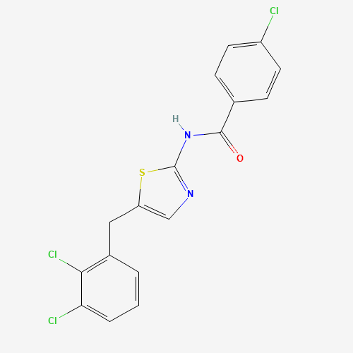 - Synonyms:4-CHLORO-N-(5-(2,3-DICHLOROBENZYL)-1,3-THIAZOL-2-YL)BENZAMIDE;4-chloro-N-[5-[(2,3-dichlorophenyl)methyl]-1,3-thiazol-2-yl]benzamide;4-chloro-N-{5-[(2,3-dichlorophenyl)methyl]-1,3-thiazol-2-yl}benzamide;4-chloro-N-[5-(2,3-dichlorobenzyl)-1,3-thiazol-2-yl]benzamide;Oprea1_398546;Oprea1_788106;STK952250;AKOS000628118;AG-690/12477718
