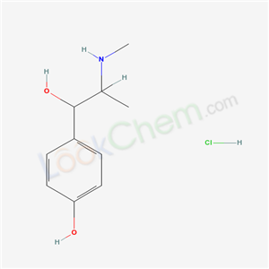 - Synonyms:Benzenemethanol,4-hydroxy-a-[1-(methylamino)ethyl]-, hydrochloride, (R*,R*)- (9CI);Benzenemethanol, 4-hydroxy-a-[1-(methylamino)ethyl]-, hydrochloride,(R*,R*)-(?-; Benzyl alcohol, p-hydroxy-a-[1-(methylamino)ethyl]-,hydrochloride, (?- (8CI); dl-1-(4-Hydroxyphenyl)-2-methyl-2-methylaminoethanolhydrochloride
