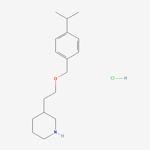 - Synonyms:1220017-98-0;4-Isopropylbenzyl 2-(3-piperidinyl)ethyl ether hydrochloride;3-(2-((4-Isopropylbenzyl)oxy)ethyl)piperidine hydrochloride;3-[2-[(4-propan-2-ylphenyl)methoxy]ethyl]piperidine;hydrochloride;4-Isopropylbenzyl 2-(3-piperidinyl)ethyl etherhydrochloride;AKOS015848065;3-(2-((4-Isopropylbenzyl)oxy)ethyl)piperidinehydrochloride