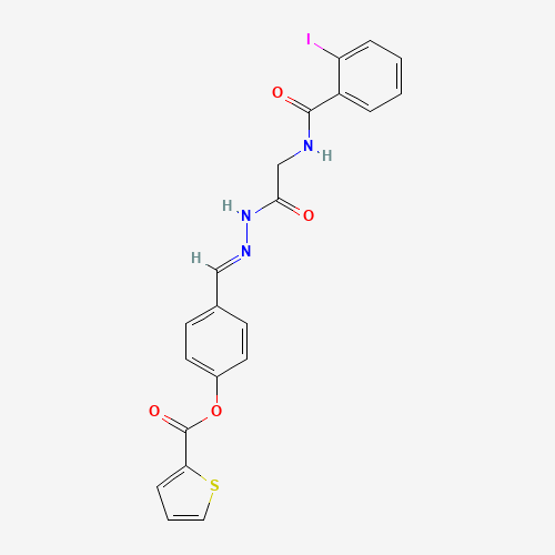 - Synonyms:AKOS024413671;4-(2-(((2-IODOBENZOYL)AMINO)AC)CARBOHYDRAZONOYL)PHENYL 2-THIOPHENECARBOXYLATE