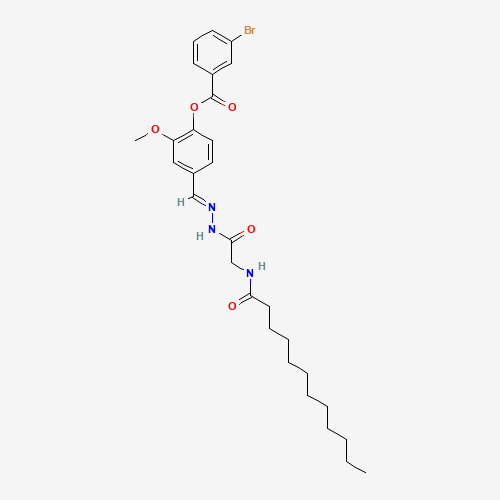 - Synonyms:AKOS024408187;4-(2-((DODECANOYLAMINO)ACETYL)CARBOHYDRAZONOYL)-2-METHOXYPHENYL 3-BROMOBENZOATE