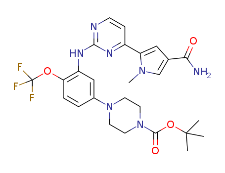 - Synonyms:4-{3-[4-(4-carbamoyl-1-methyl-1H-pyrrol-2-yl)pyrimidin-2-ylamino]-4-trifluoromethoxyphenyl}piperazine-1-carboxylic acid tert-butyl ester