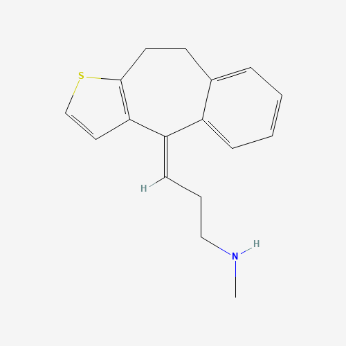 - Synonyms:IBD 78;89DHK9432D;UNII-LVH0SCF4XH;4-(3'-Methylaminopropylidene)-9,10-dihydro-4H-benzo(4,5)cyclohepta(1,2-b)thiophen;IBD-78, (E)-;BRN 1347799;UNII-89DHK9432D;IBD-78;10083-53-1;4H-Benzo(4,5)cyclohepta(1,2-b)thiophene, 9,10-dihydro-4-(3-methylaminopropylidene)-;1-Propanamine, 3-(9,10-dihydro-4H-benzo(4,5)cyclohepta(1,2-b)thien-4-ylidene)-N-methyl-, (E)-;46962-44-1;(3E)-N-methyl-3-(6-thiatricyclo[8.4.0.03,7]tetradeca-1(14),3(7),4,10,12-pentaen-2-ylidene)propan-1-amine;C17-H19-N-S;LVH0SCF4XH;(E)-ibd-78;1-Propanamine, N-methyl-3-(9,10-dihydro-4H-benzo[4,5]cyclohepta[1,2-b]thien-4-ylidene)-;LS-33819;Q27270029