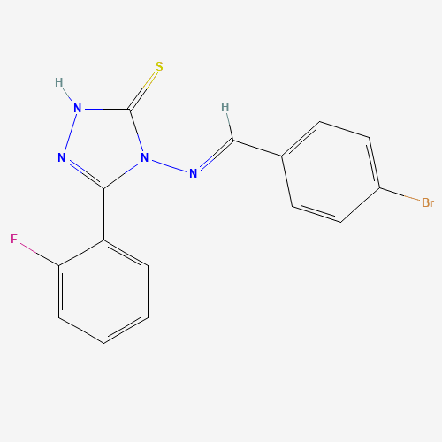 - Synonyms:573973-61-2;4-((4-Bromobenzylidene)amino)-3-(2-fluorophenyl)-1H-1,2,4-triazole-5(4H)-thione;STK577134;AKOS005501761;AKOS024320295;4-((4-BR-BENZYLIDENE)AMINO)-5-(2-F-PHENYL)-4H-1,2,4-TRIAZOL-3-YL HYDROSULFIDE;4-{[(E)-(4-bromophenyl)methylidene]amino}-5-(2-fluorophenyl)-2,4-dihydro-3H-1,2,4-triazole-3-thione