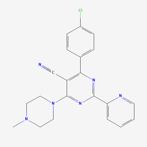 - Synonyms:320418-23-3;4-(4-chlorophenyl)-6-(4-methylpiperazino)-2-(2-pyridinyl)-5-pyrimidinecarbonitrile;4-(4-chlorophenyl)-6-(4-methylpiperazin-1-yl)-2-(pyridin-2-yl)pyrimidine-5-carbonitrile;4-(4-chlorophenyl)-6-(4-methylpiperazin-1-yl)-2-pyridin-2-ylpyrimidine-5-carbonitrile;CDS1_001091;Bionet1_000115;Oprea1_247179;DivK1c_002131;HMS568B17;AKOS005081966;1E-122S
