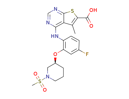 - Synonyms:4-[4-Fluoro-2-((S)-1-methanesulfonyl-piperidin-3-yloxy)-phenylamino]-5-methyl-thieno[2,3-d]pyrimidine-6-carboxylic acid