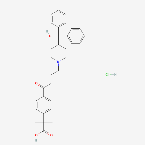 - Synonyms:4-[4-(4-(hydroxydiphenylmethyl)-1-piperidinyl)-1-oxobutyl]-alpha,alpha-dimethylbenzeneacetic acid hydrochloride;4-[4-(4-(hydroxydiphenylmethyl)-1-piperidinyl]-1-oxobutyl]-alpha,alpha-dimethylbenzeneacetic acid hydrochloride;4-[4-[4-(hydroxydiphenylmethyl)-1-piperidinyl]-1-oxobutyl]-alpha,alpha-dimethylbenzeneacetic acid hydrochloride;SCHEMBL3681404;WQPDEFGECAUPKV-UHFFFAOYSA-N;153439-43-1;4-[4-[ 4-(hydroxydiphenylmethyl)-1-piperidinyl]-1-oxobutyl]-alpha,alpha-dimethylbenzeneacetic acid hydrochloride;4-[4-[4-(hydroxydiphenylmethyl)-1-piperidinyl]-1-oxobutyl] -alpha,alpha-dimethylbenzeneacetic acid hydrochloride;4-[4-[4-(Hydroxydiphenylmethyl)-1-piperidinyl]-1-oxobutyl]-alpha, alpha-dimethylbenzeneacetic acid hydrochloride