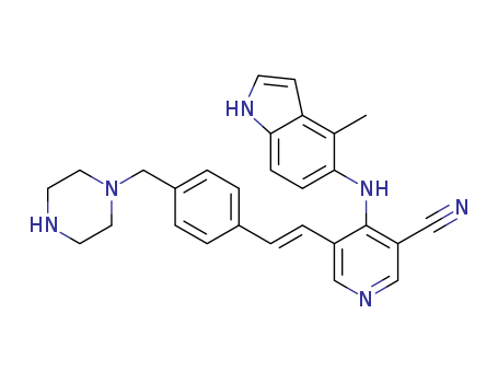 - Synonyms:4-[(4-methyl-1H-indol-5-yl)amino]-5-{(E)-2-[4-(piperazin-1-ylmethyl)phenyl]vinyl}nicotinonitrile