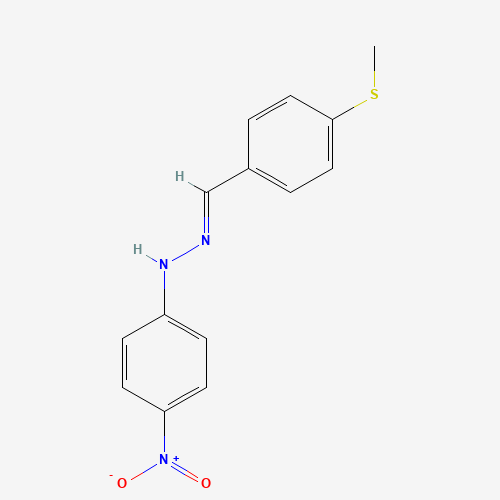 - Synonyms:4-(methylsulfanyl)benzaldehyde {4-nitrophenyl}hydrazone;1352193-86-2;RMFPZJBQZMODMX-XNTDXEJSSA-N;1-[4-(methylsulfanyl)benzylidene]-2-(4-nitrophenyl)hydrazine;DTXSID001165126;STK075337;AKOS000486188;AG-205/09994049;SR-01000090185;SR-01000090185-1;(1E)-1-[4-(methylsulfanyl)benzylidene]-2-(4-nitrophenyl)hydrazine;N-[(E)-(4-methylsulfanylphenyl)methylideneamino]-4-nitroaniline;Benzaldehyde, 4-(methylthio)-, 2-(4-nitrophenyl)hydrazone, [C(E)]-;(1E)-1-{[4-(METHYLSULFANYL)PHENYL]METHYLIDENE}-2-(4-NITROPHENYL)HYDRAZINE