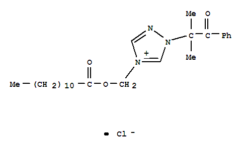 - Synonyms:1H-1,2,4-Triazolium,1-(1,1-dimethyl-2-oxo-2-phenylethyl)-4-[[(1-oxododecyl)oxy]methyl]-, chloride(9CI); NKI 42002