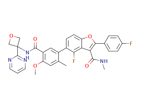- Synonyms:4-fluoro-2-(4-fluorophenyl)-5-(4-methoxy-2-methyl-5-(3-(pyrimidin-2-yl)oxetan-3-ylcarbamoyl)phenyl)-N-methylbenzofuran-3-carboxamide