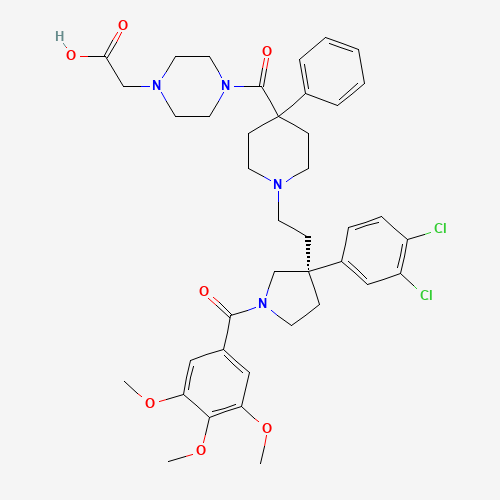 - Synonyms:4CQ5ZXK5FB;AVE-5883 (R)-isomer;1-Piperazineacetic acid, 4-((1-(2-((3R)-3-(3,4-dichlorophenyl)-1-(3,4,5-trimethoxybenzoyl)-3-pyrrolidinyl)ethyl)-4-phenyl-4-piperidinyl)carbonyl)-;2-(4-(1-(2-((3R)-3-(3,4-Dichlorophenyl)-1-(3,4,5-trimethoxybenzoyl)pyrrolidin-3-yl)ethyl)-4-phenyl-piperidine-4-carbonyl)piperazin-1-yl)acetic acid;209666-36-4;4-((1-(2-((3R)-3-(3,4-Dichlorophenyl)-1-(3,4,5-trimethoxybenzoyl)-3-pyrrolidinyl)ethyl)-4-phenyl-4-piperidinyl)carbonyl)-1-piperazineacetic acid;UNII-4CQ5ZXK5FB