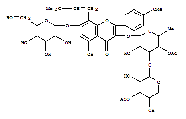 - Name: 4H-1-Benzopyran-4-one,3-[[4-O-acetyl-3-O-(3-O-acetyl-b-D-xylopyranosyl)-6-deoxy-a-L-mannopyranosyl]oxy]-7-(b-D-glucopyranosyloxy)-5-hydroxy-2-(4-methoxyphenyl)-8-(3-methyl-2-butenyl)-(9CI)